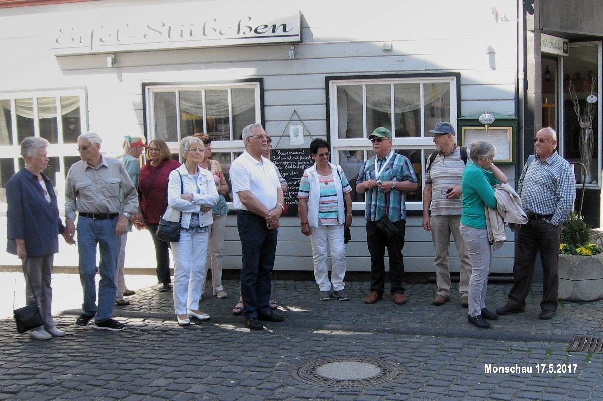 In diesem Jahr besuchten bei fast hochsommerlichem Wetter die Senioren/innen der Duisburger Polizei mit "Anhang" am 17. Mai die Stadt MONSCHAU in der Eifel per Reisebus. Die Führung durch die Stadt und deren Geschichte war sehr eindrucksvoll und hinterließ mit Sicherheit einen bleibenden Eindruck bei uns. Spätnachmittag ging es dann mehr als geschafft (das sommerliche und sehr warme Wetter trug dazu bei) nach Duisburg zurück. Allerdings mit einem unerwarteten "Hindernis": Auf der Autobahn (BAB-Kreuz Wanlo bis Grevenbroich) gerieten wir bedingt durch einen Unfall in einen langen Stau und "verloren" gut 1,5 Stunden!!