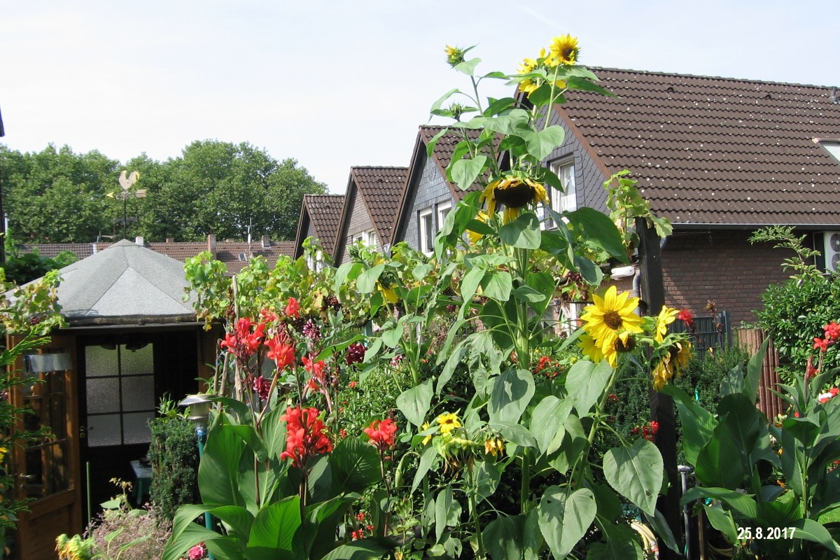 Siehe auch: http://www.diesandburg.de/ Bald wird unsere "grüne Hölle" wieder verschwunden sein ...... Trotz einem sehr trockenen Frühjahr und auch Frühsommer ist unsere "grüne Hölle" mehr als gewachsen und zum Teil auch "gewuchert" (wurde ja auch intensiv mit Brunnenwasser bewässert). Große Sonnenblumen (ca. 3 Meter hoch), riesige Dahlien, jede Menge Weintrauben - aber keine Vögel wie z.B. Meisen, ab und zu eine Amsel und nur ein Rotkehlchen. In den Vorjahren wurden die Sonnenblumen -noch nicht einmal richtig gereift- von täglich anwesenden 10 bis 15 Meisen entsprechend "abgeerntet". An den reichlich vorhandenen Weintrauben "labten" sich sonst vier bis fünf Amseln. WO sind diese Vögel dieses Jahr nur geblieben????